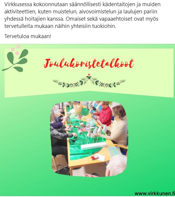 Pohjois-Karjalan Sairaskotiyhdistys ry:lle tehdyssä esittelyvideossa olen ollut selostustekstin suunnittelijana.